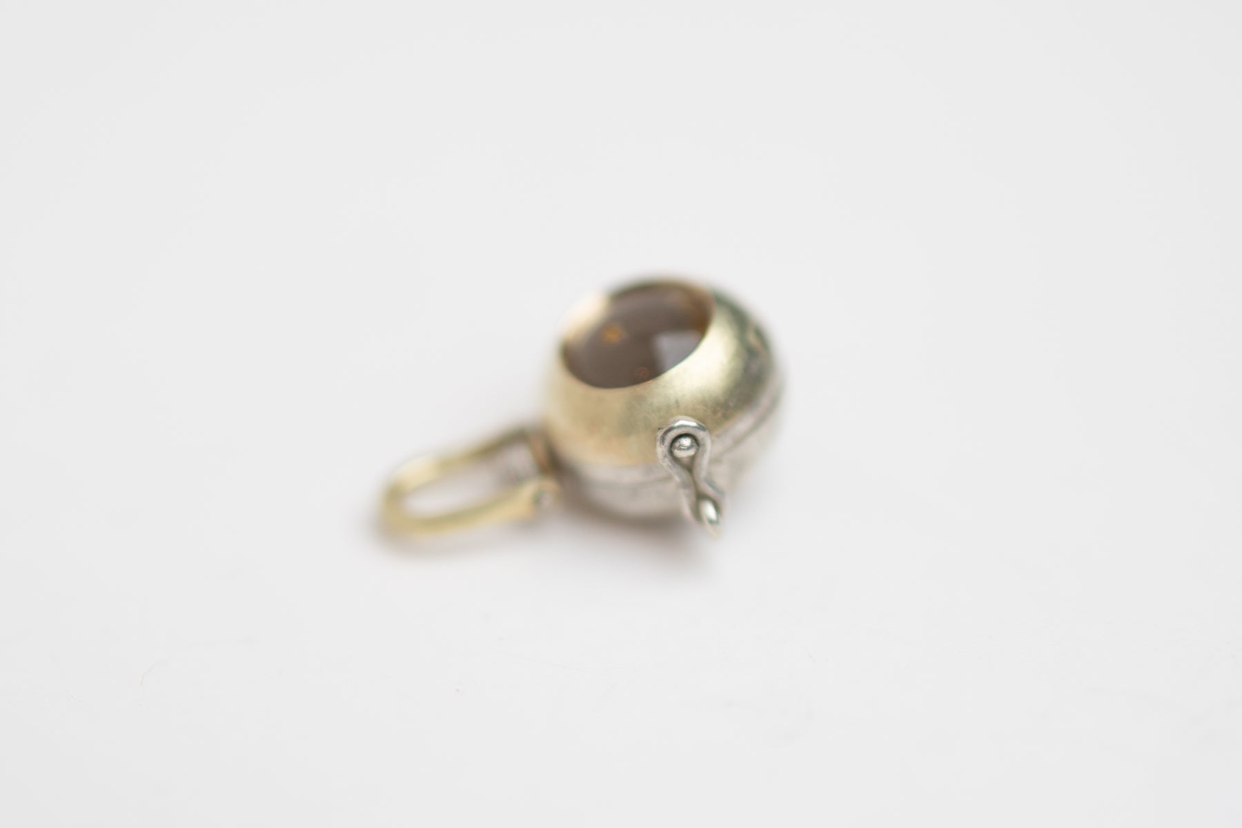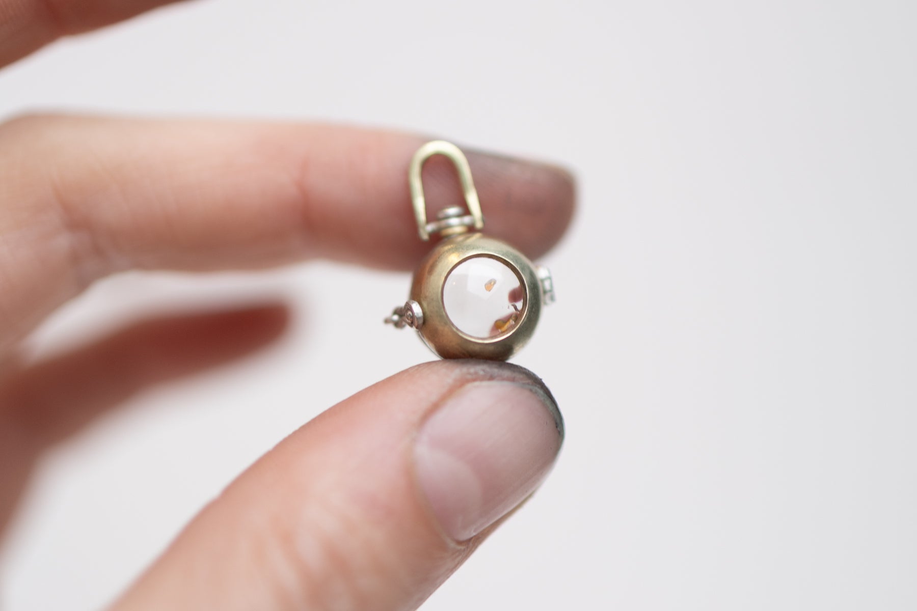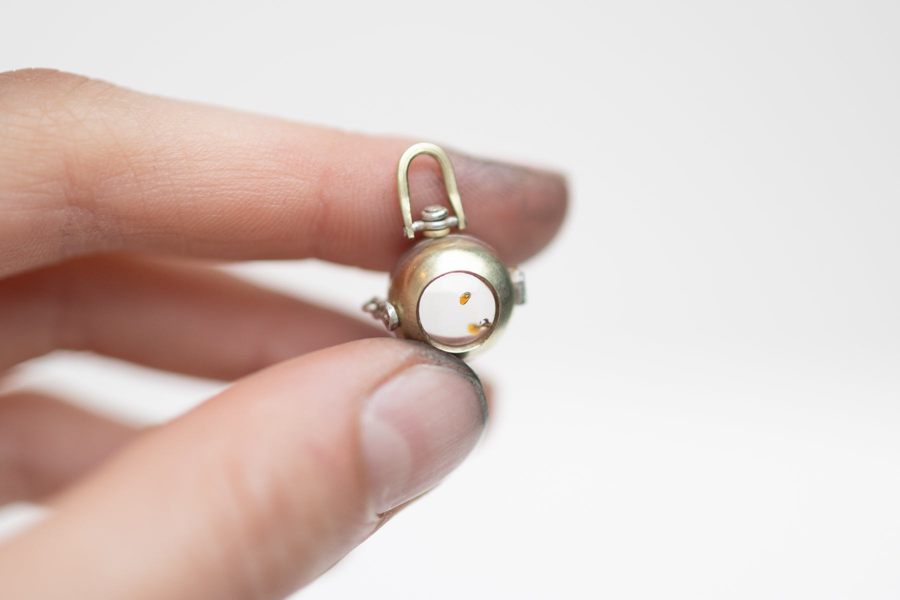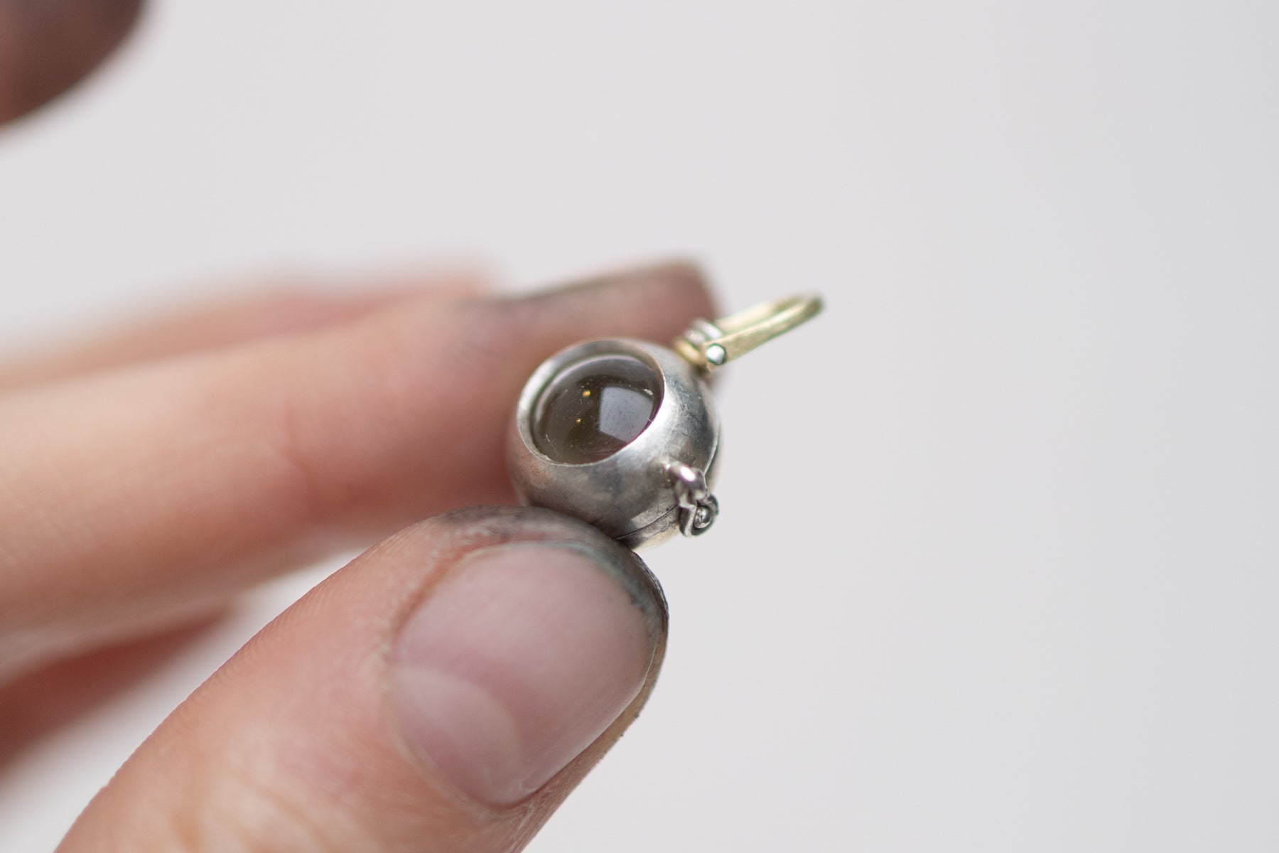 A 10 mm petroleum‑included quartz sphere cradled in mixed 14k yellow gold and sterling silver, featuring a mesmerizing moving air bubble and petroleum inclusions that shimmer and glow under UV light for an otherworldly, miniature universe you can wear.